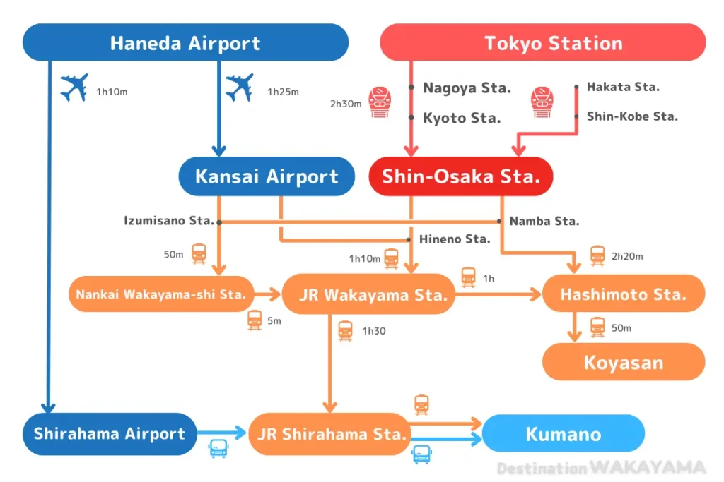 - Kansai Airport → Izumisano → Wakayama City: 50m-1h