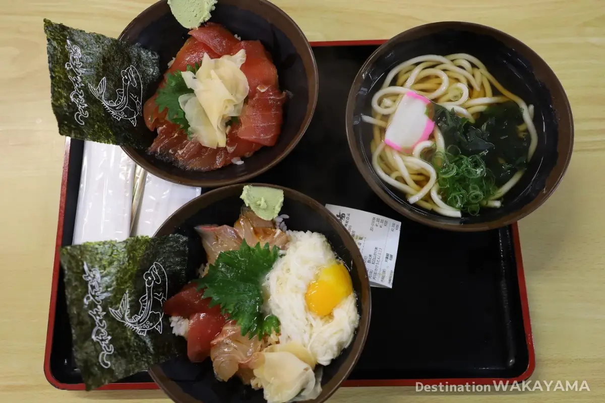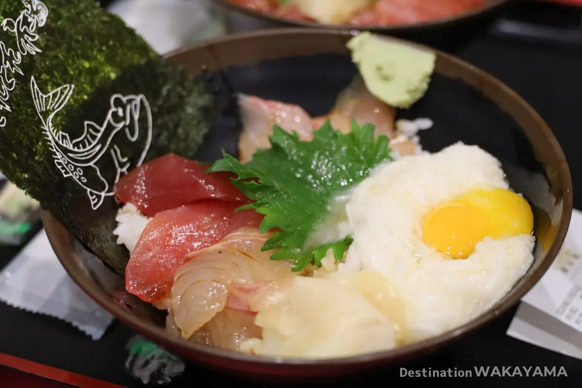 The Shirahama branch of Marutaya offers a limited menu item called “Maguro-meshi,” which features fresh tuna chunks topped with a special egg over rice. It rivals the seafood bowls at Toretore Market in quality.