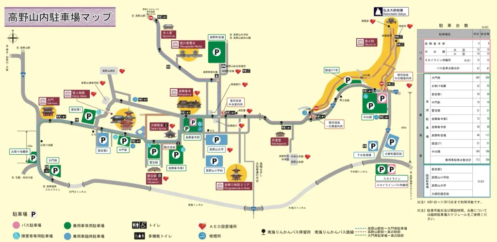 There are several parking lots around Mount Koya, and some are located close to major attractions. However, these can get crowded during peak seasons, so plan to arrive early if possible.