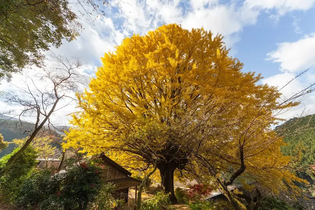Hosenji Temple, located in Nakahechi Town, Tanabe City, is a historic temple famous for the large ginkgo tree in its grounds. This tree is estimated to be around 400 years old, standing 22 meters tall with a trunk circumference of 5.3 meters. In autumn, the ginkgo leaves turn a brilliant gold, creating a stunning sight.