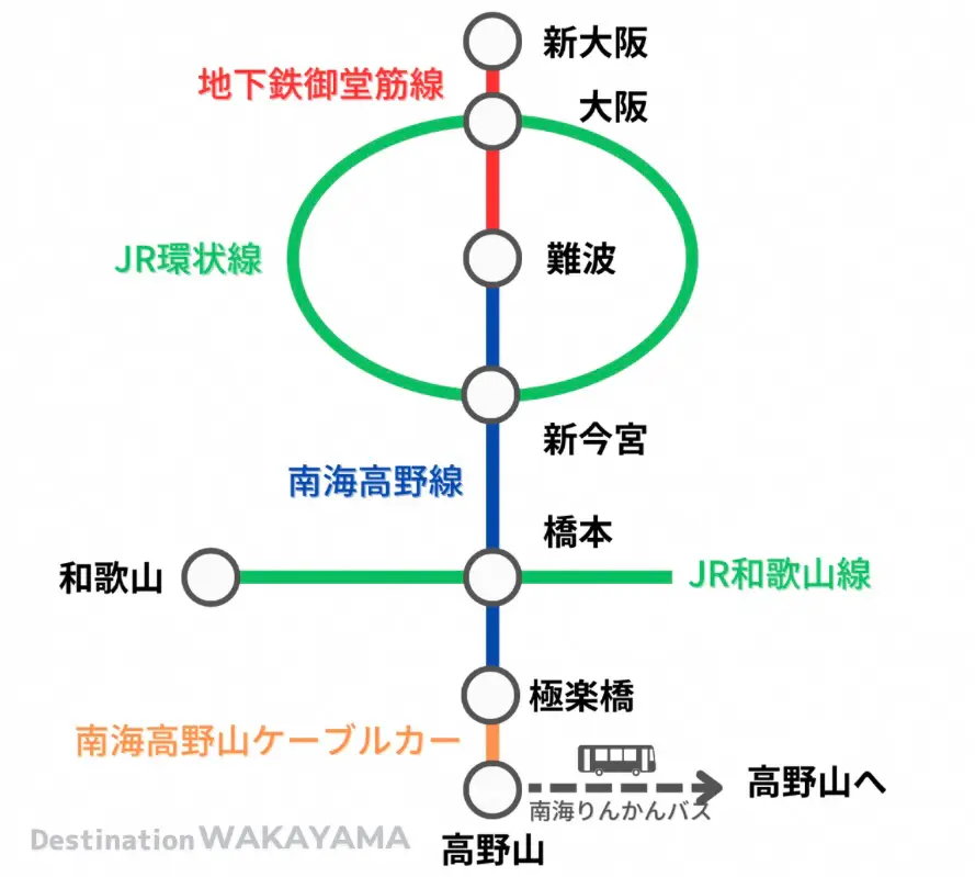 京都站 → 新大阪站 → 大阪地鐵難波站・南海難波站 → 極樂橋站 → 高野山站 → 高野山各地