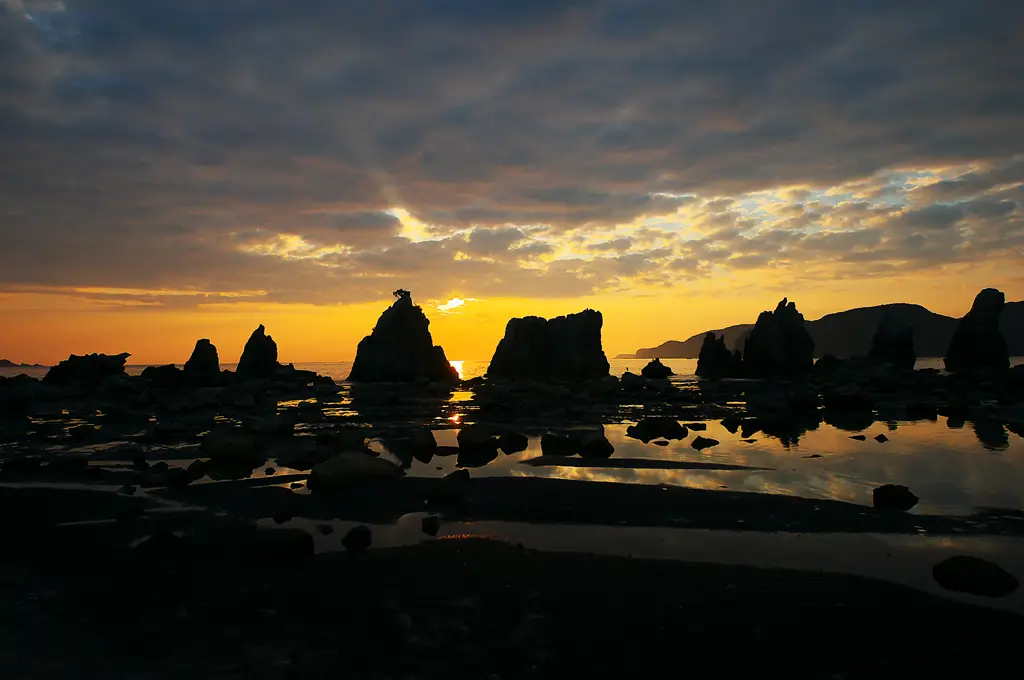 橋杭岩會隨著時間帶與潮汐變化,展現出截然不同的面貌。